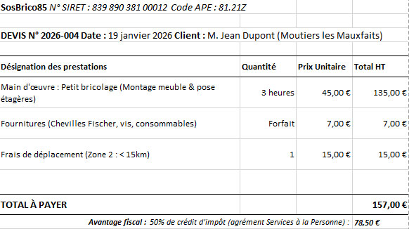 Style de devis réalisé, prenant compte le temps de main d'oeuvre, le coût des fournitures, ainsi que les frais de déplacement.