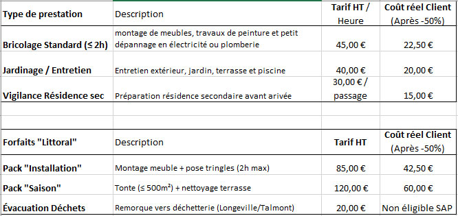 Mes différents taux horaires suivant prestation demandées avec coût réel client. ainsi que les forfaits proposés.